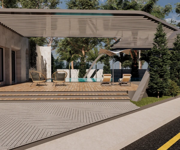 Personal lawn and wooden-deck parking